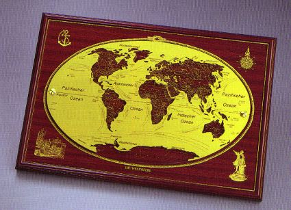 mit Darstellung der Weltmeere, geblockte Acrylglasplatte mit in gold gedruckten