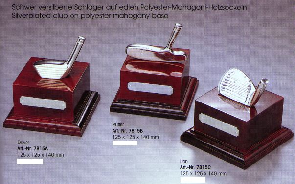 versilberte Golf-Schläger auf edlen Polyester-Mahagoni-Holzsockeln,